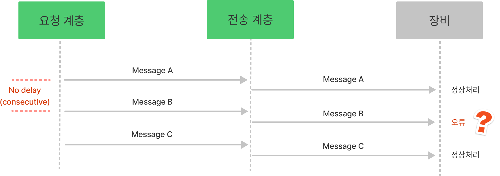 테스트 중 상황에 따라 요청 계층에서 전송 계층으로 연속적인 N개의 메시지 전송 요청이 발생하였는데 이때 중간 중간 타겟 시스템에서 메시지가 처리되지 않는 문제가 발생하였습니다.