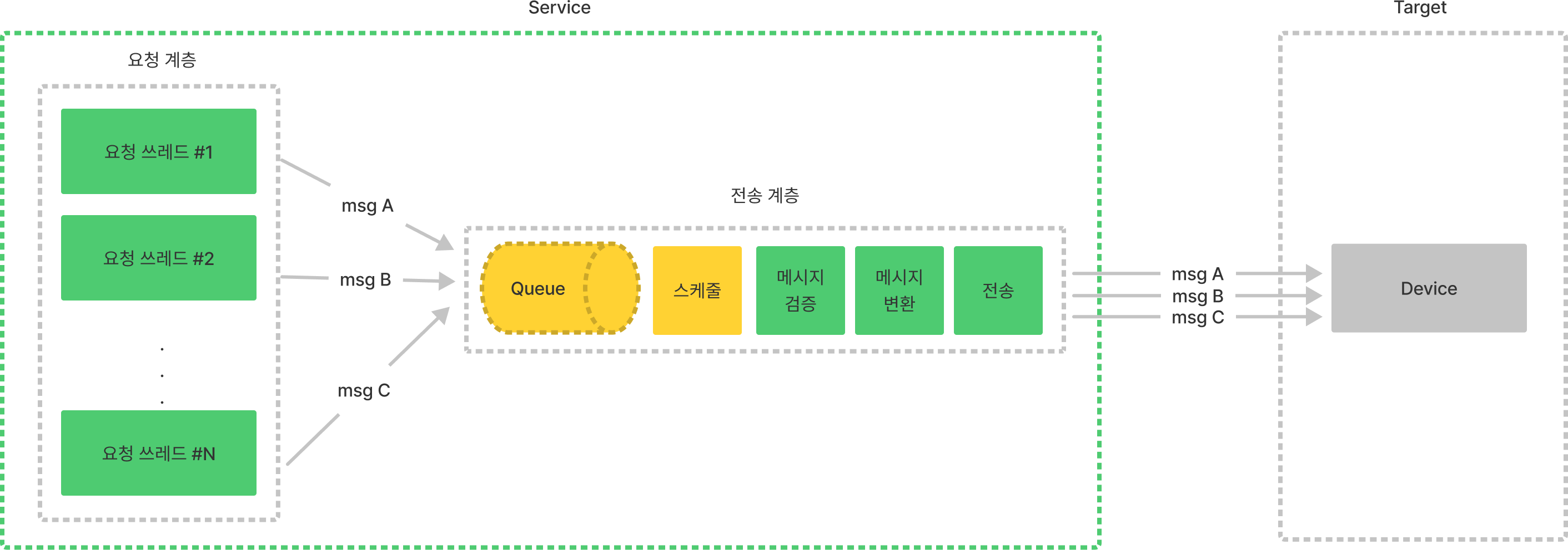 이제 전송하는 메시지의 타이밍을 제어할 수 있도록 메시지큐를 요청 계층과 전송 계층 사이에 두고 스케줄러가 메시지와 메시지 사이의 간격을 조정해 주도록 다음과 같이 설계를 변경합니다.
