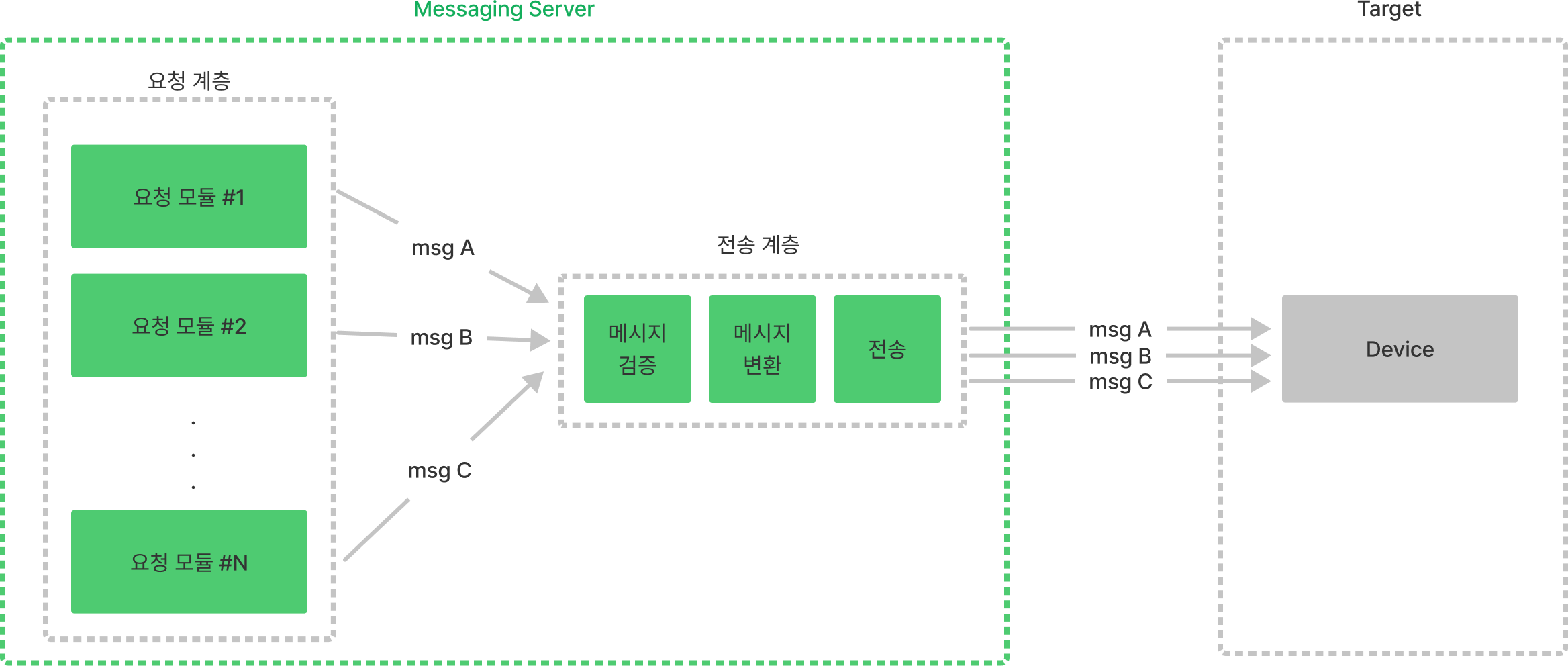 문제가 발생한 기존 시스템은 아래와 같이 메시지 요청과 전송 두 계층으로 간략화 할 수 있습니다.