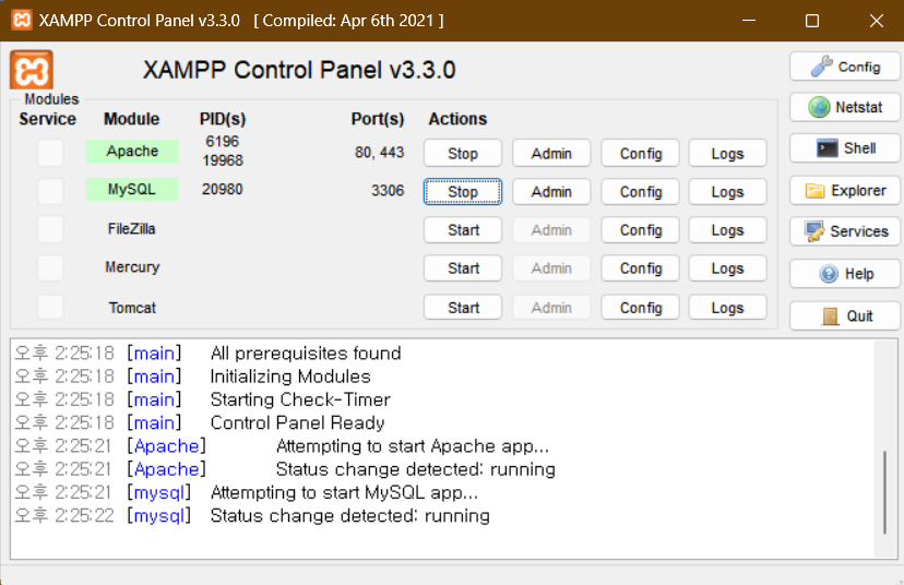 또 가끔 보면 이미 80포트나 3600(?) 맞나? 포트를 사용하고 있는 경우가 있어서 해당경우에는 config 버튼으로 php.ini의 port를 수정해주거나 Mysql의 my.ini의 port를 수정해줘도 된다.