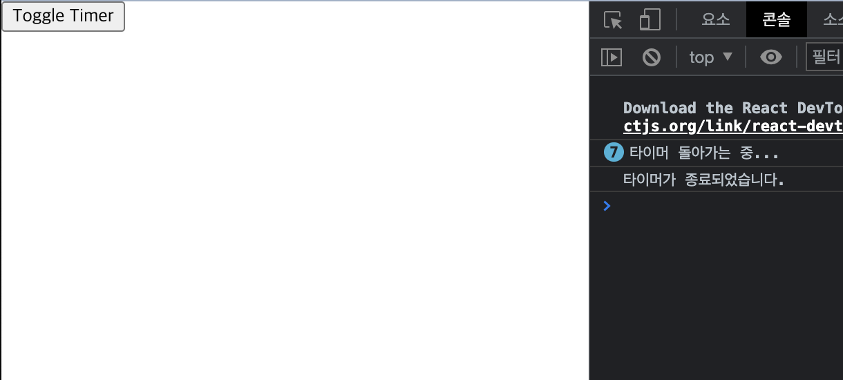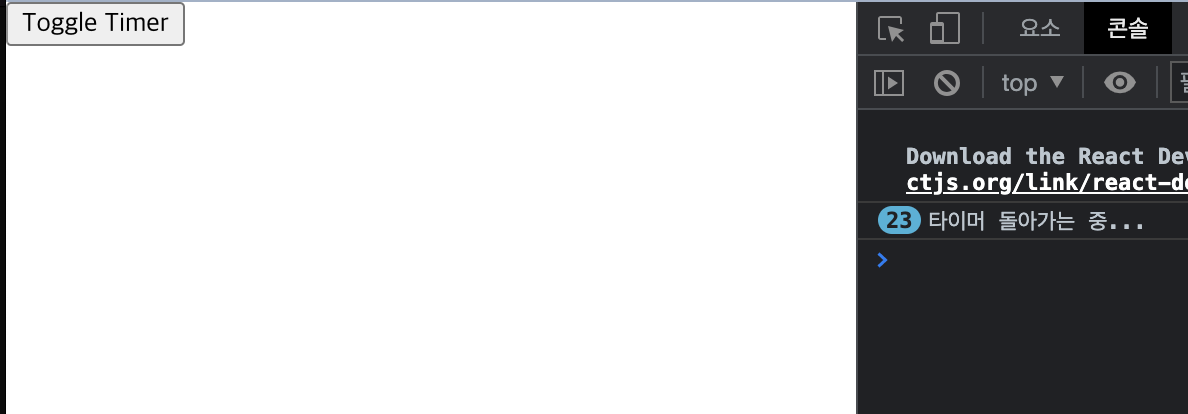 위 코드를 살펴보면, Timer 컴포넌트를 실행시 useEffect가 바로 수행되어 1초마다 "타이머 돌아가는 중..." 이라는 문자열을 콘솔로 출력하게 됩니다.