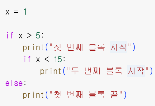 "두 번째 블록 시작" 이렇게 나올 것이다. 왜냐면 if문의 첫번째 조건을 만족하고, 그 뒤에 있는 두번째 if문도 충족하기 때문이다.