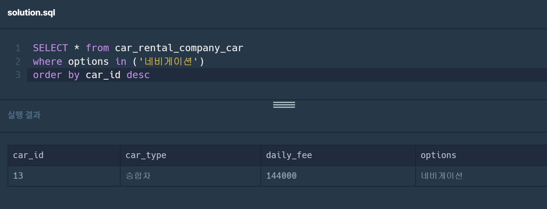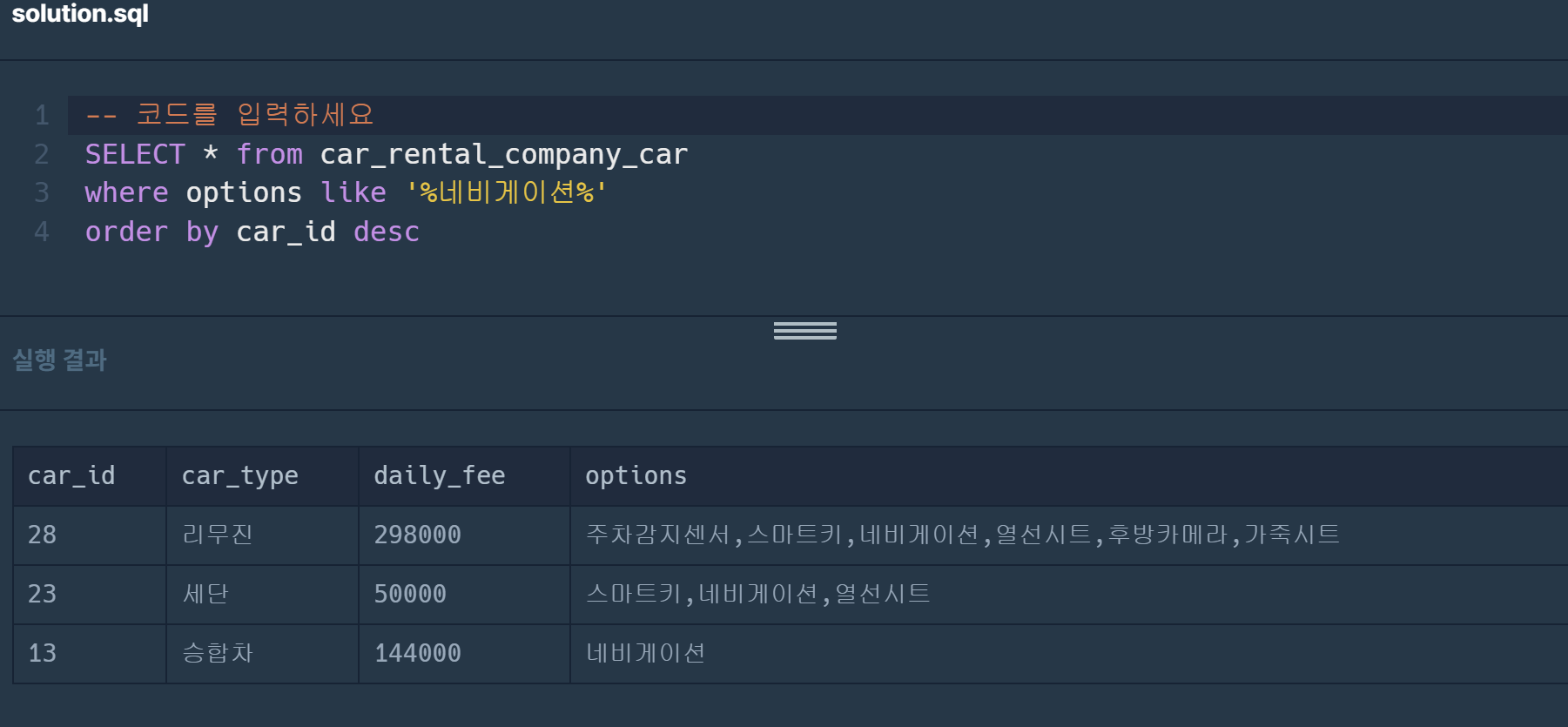 sql 두번째 문제: CAR_RENTAL_COMPANY_CAR 테이블에서 '네비게이션' 옵션이 포함된 자동차 리스트를 출력하는 SQL문을 작성해주세요. 결과는 자동차 ID를 기준으로 내림차순 정렬해주세요.