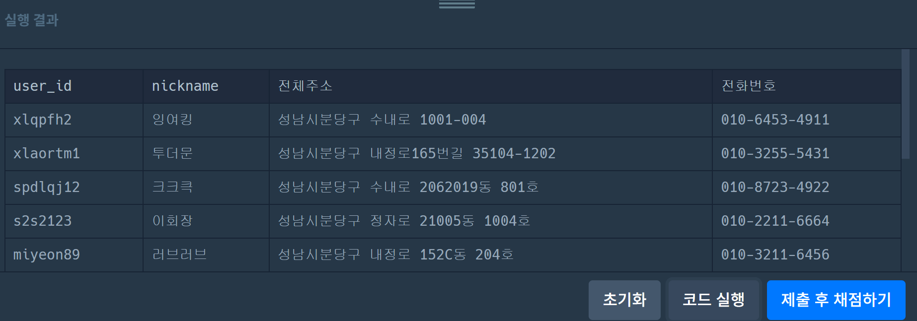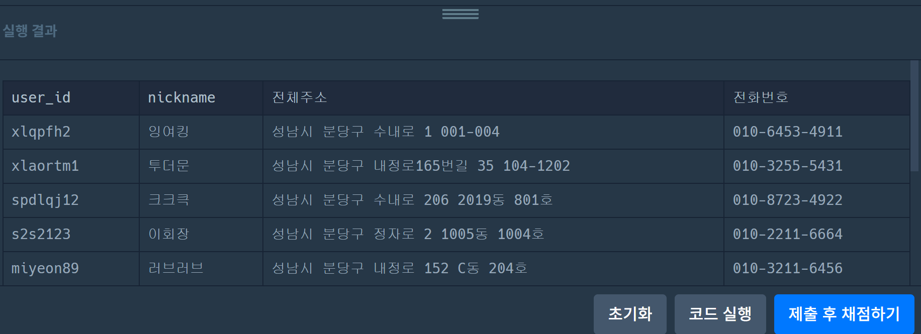 select user_id, nickname, concat(city, street_address1, street_address2) as 전체주소, concat(substr(tlno,1,3),'-',substr(tlno,4,4),'-',substr(tlno,8,4)) as 전화번호