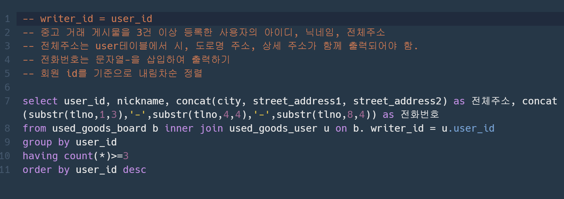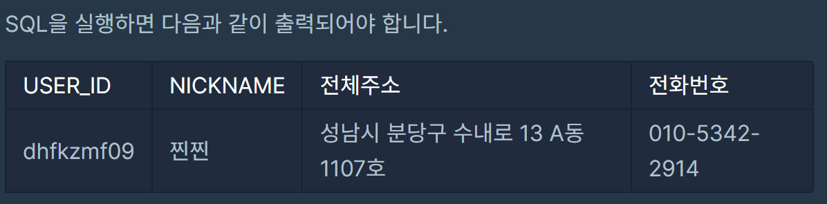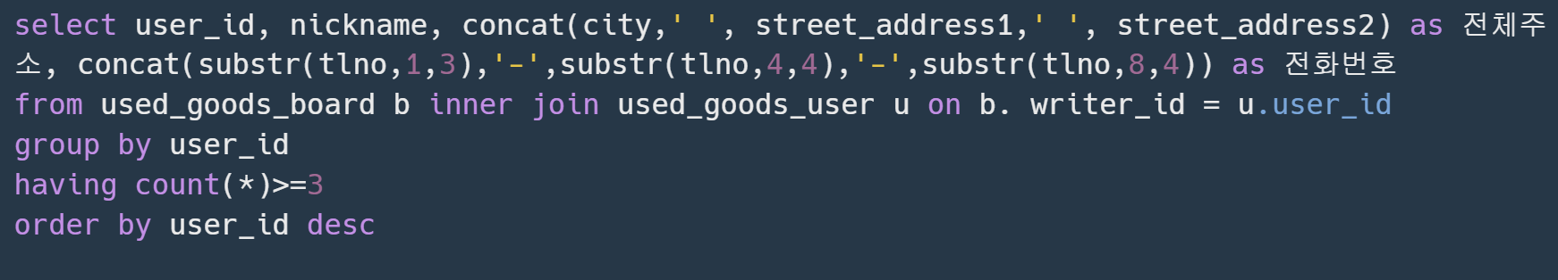 select user_id, nickname, concat(city,' ', street_address1,' ', street_address2) as 전체주소, concat(substr(tlno,1,3),'-',substr(tlno,4,4),'-',substr(tlno,8,4)) as 전화번호