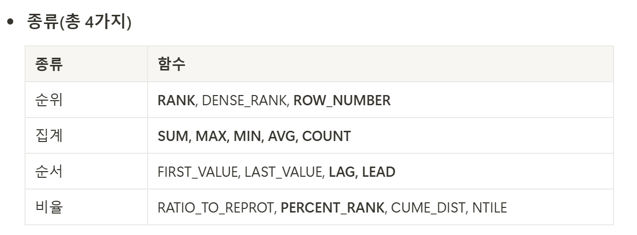 종류에는 순위를 매기는 함수, 집계함수, 순서함수, 비율함수가 있다.