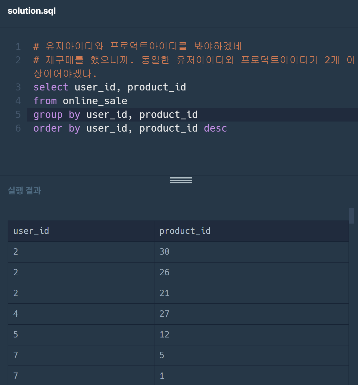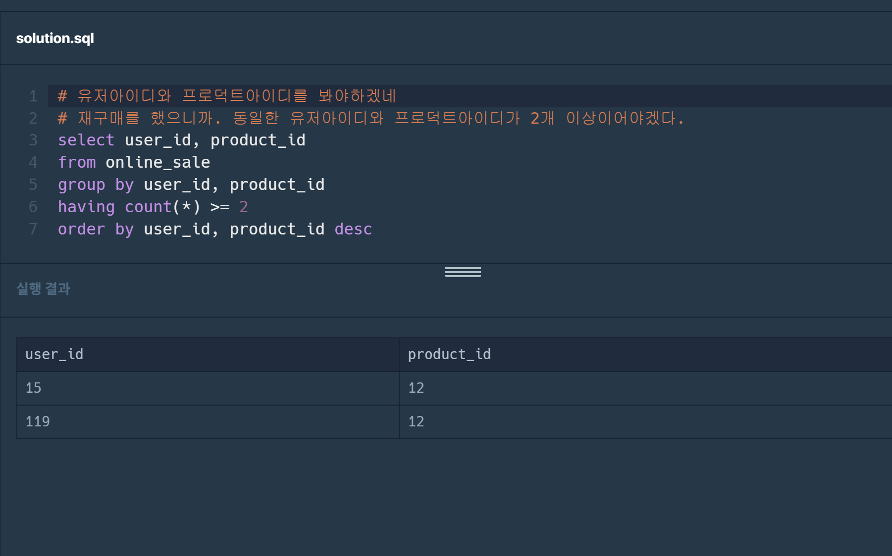 ->저 쿼리에서 중복되는 행을 구하면 되니까: count(*)를 써줘서 중복된 행을 구해줄 수 있다.