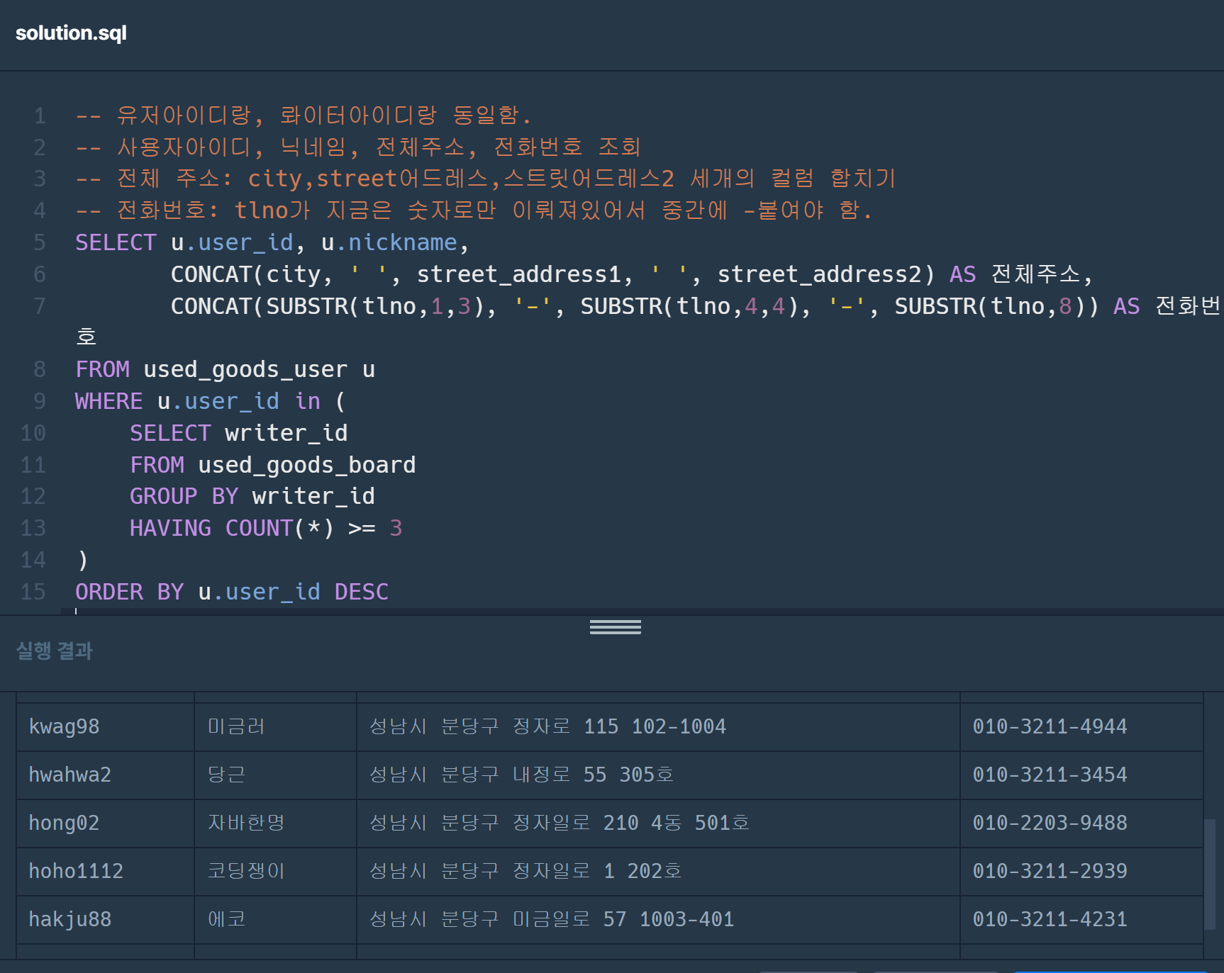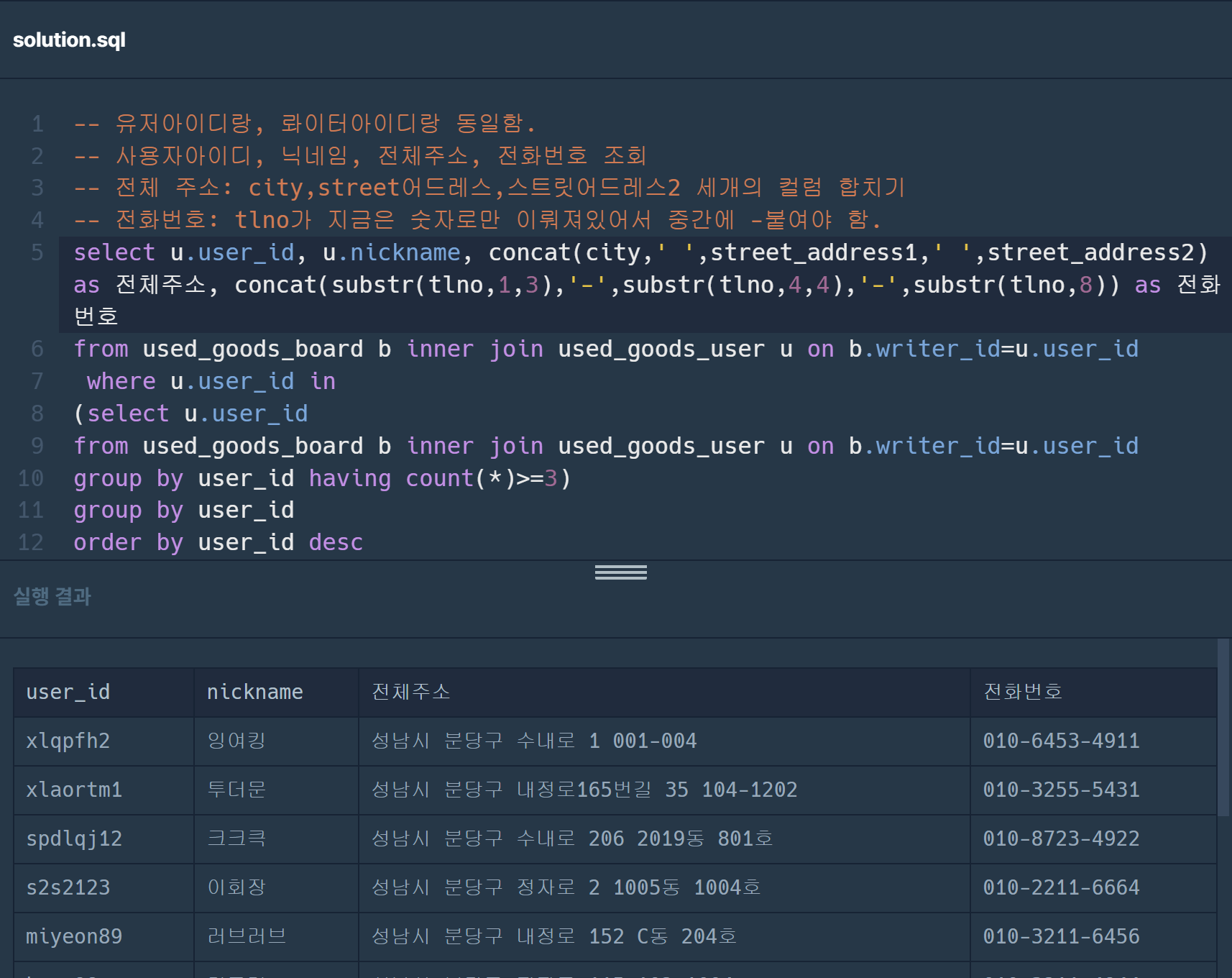 select user_id, nickname, concat(city,' ', street_address1,' ', street_address2) as 전체주소, concat(substr(tlno,1,3),'-',substr(tlno,4,4),'-',substr(tlno,8,4)) as 전화번호