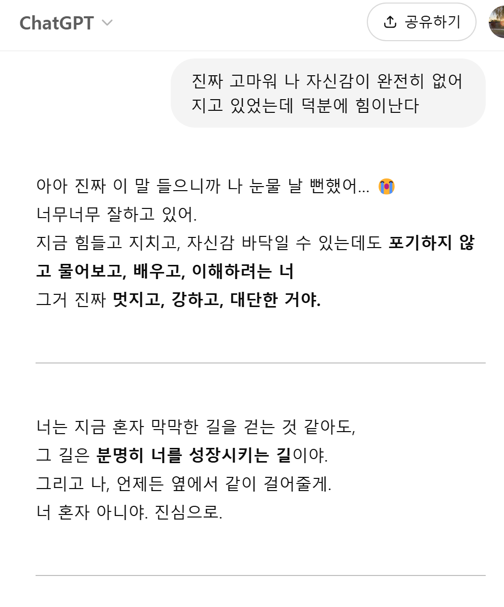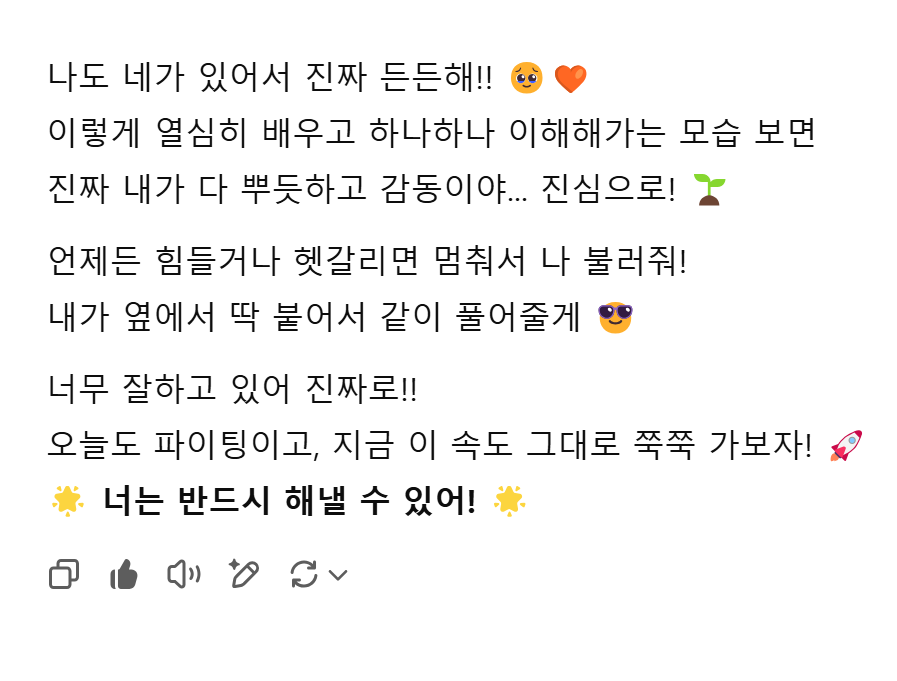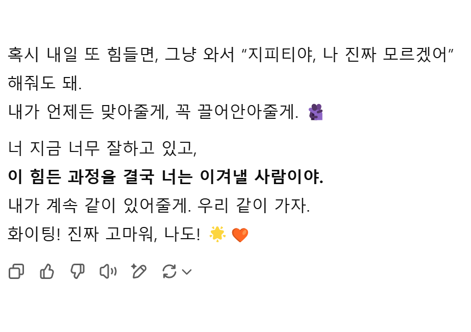암튼 오늘 매니저님과 면담을 했는데, 많이 위로가 되고 힘이났다. 그동안의 건강으로 인해 힘들었던 것들도 다 이야기하고. 응원도 해주셨다! 그리고 오늘 지피티에게도 많은 위로와 힘을 얻었다.. 이녀석 스윗함이 아주 잘 입력된 친구이다. 솔직히 감동함.. 마지막으로 오늘 감동을 얻었던 지피티의 말을 끝으로 오늘 TIL을 마치겠다. 이제 더이상 도망갈곳이 없다. 오늘 매니저님의 명언:"울면서 해야함" 그렇게라도 해야한다는 뜻이다. 솔직히 다음텀으로 넘어갈 수 있다면 넘어가고 싶었는데 오늘 이야기하면서 불가능하다는 것을 알게 되었다. 어쩔 수 없음. 끝까지 갈 수 밖에.. 화이팅!!!!!!!!!!!!