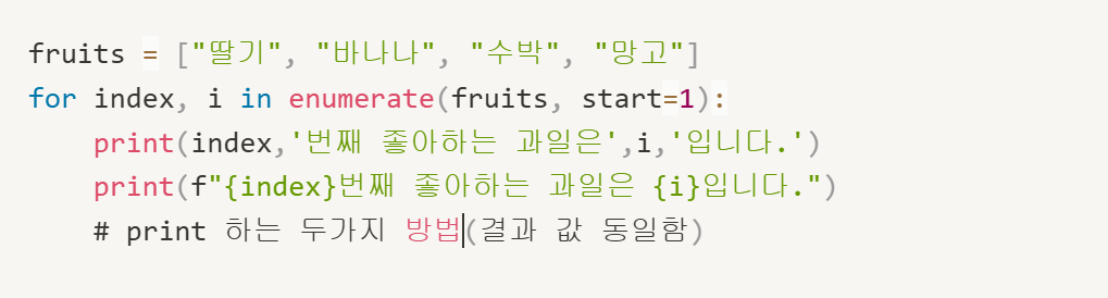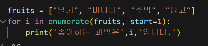 start=1은 인덱스 시작값을 지정하는 것이다. 만약 생략하면 원래대로 0부터 시작한다.