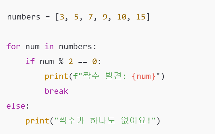 else: 반복문이 break 없이 정상적으로 완료되었을 때 실행되는 코드 블록