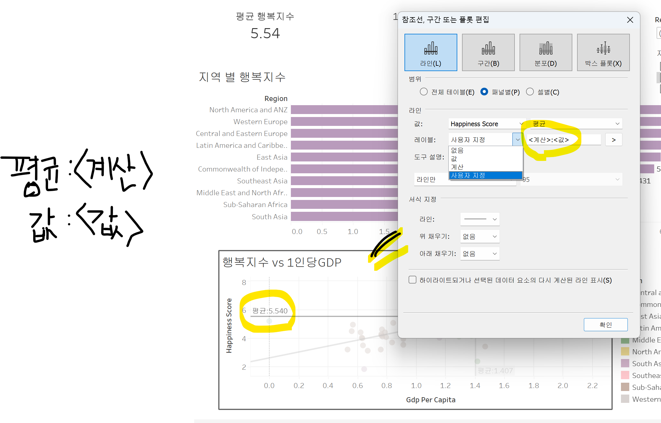평균차트 그릴 때: 평균이라는 문자는 레이블에서 계산이란 값이고, 실제 평균값(숫자)은 레이블에서 값이라는 값임. 그래서 둘 다 나오게 해줄려면 사용자 서식에서 밑의 그림과 같이 표현해 줄 수 있음.