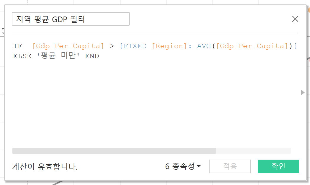 LOD식 에서 fixed 식: {FIXED 고정할 컬럼 : 집계식(집계식 계산할 컬럼)} ex) {FIXED [Region]: AVG([Gdp Per Capita])} -> 지역별로 1인당 GDP의 평균값을 구할 수 있음.