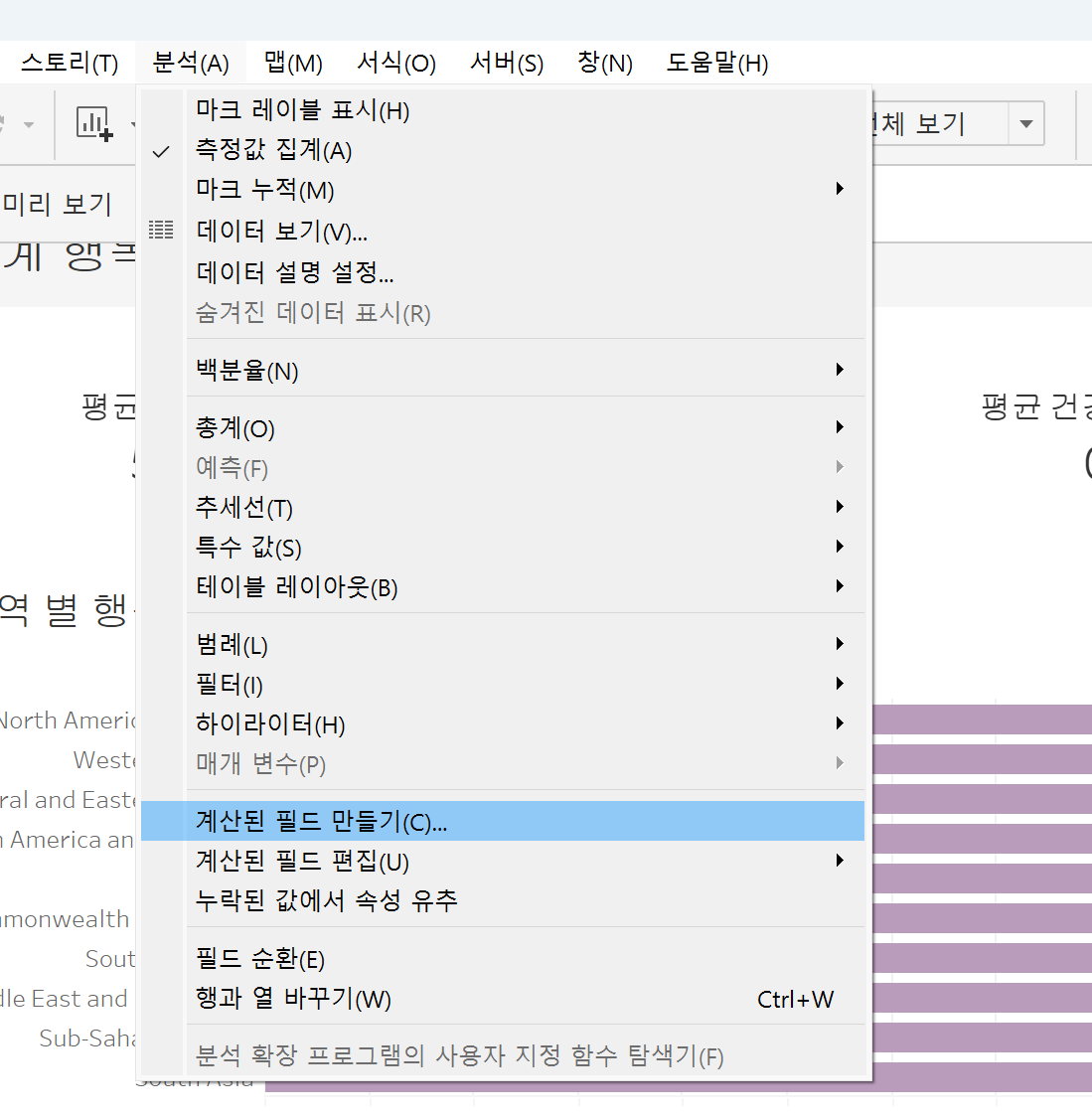계산식 만들기: 분석탭에서 계산된 필드 만들기 선택해주면 됨.