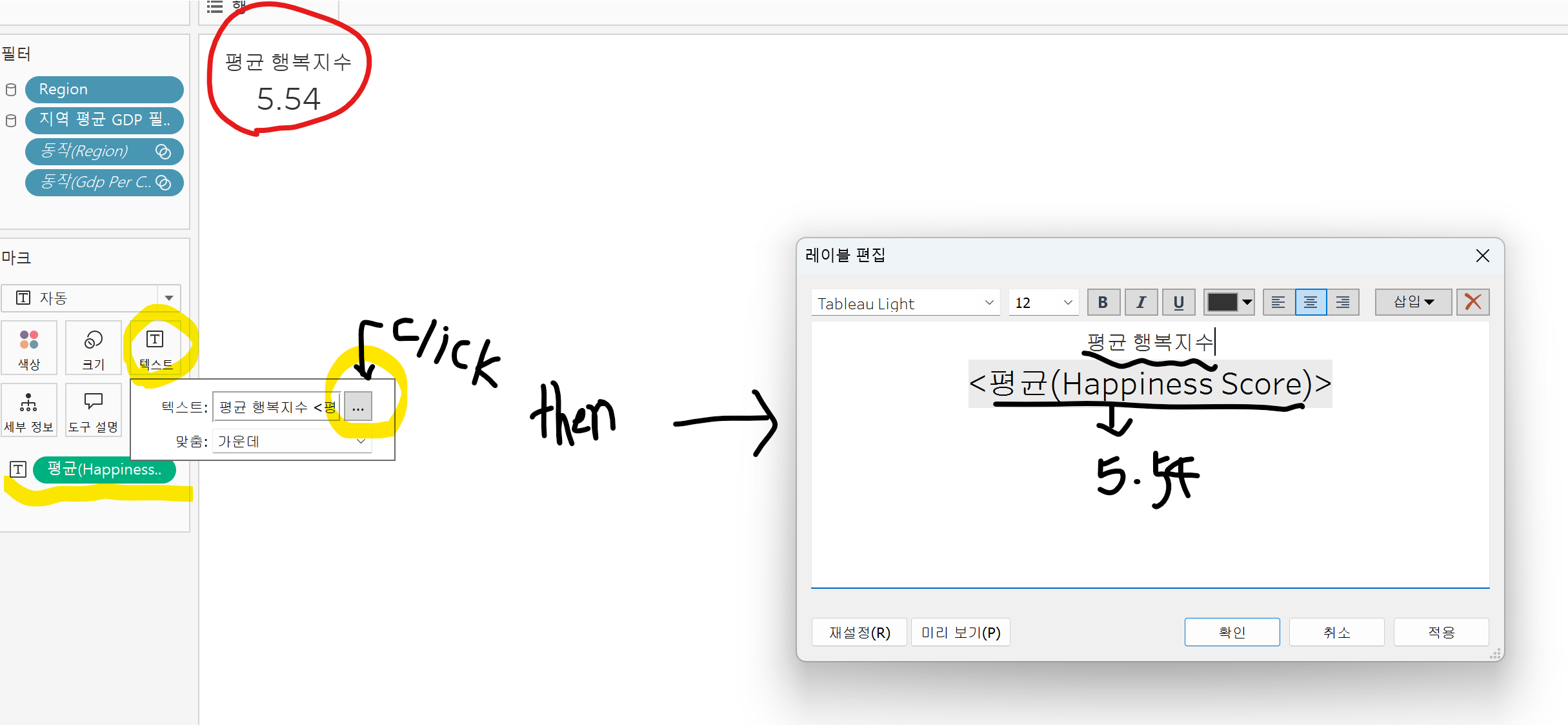 그래서 레이블에서 '계산'을 선택하면 실제 표에서 '평균'이라는 문자만 나오고, '값'을 선택하면 실제 표에서는 5.540이라는 숫자만 나옴. 그리고 평균이란 값은 레이블위의 값에서 평균값을 선택하였음.