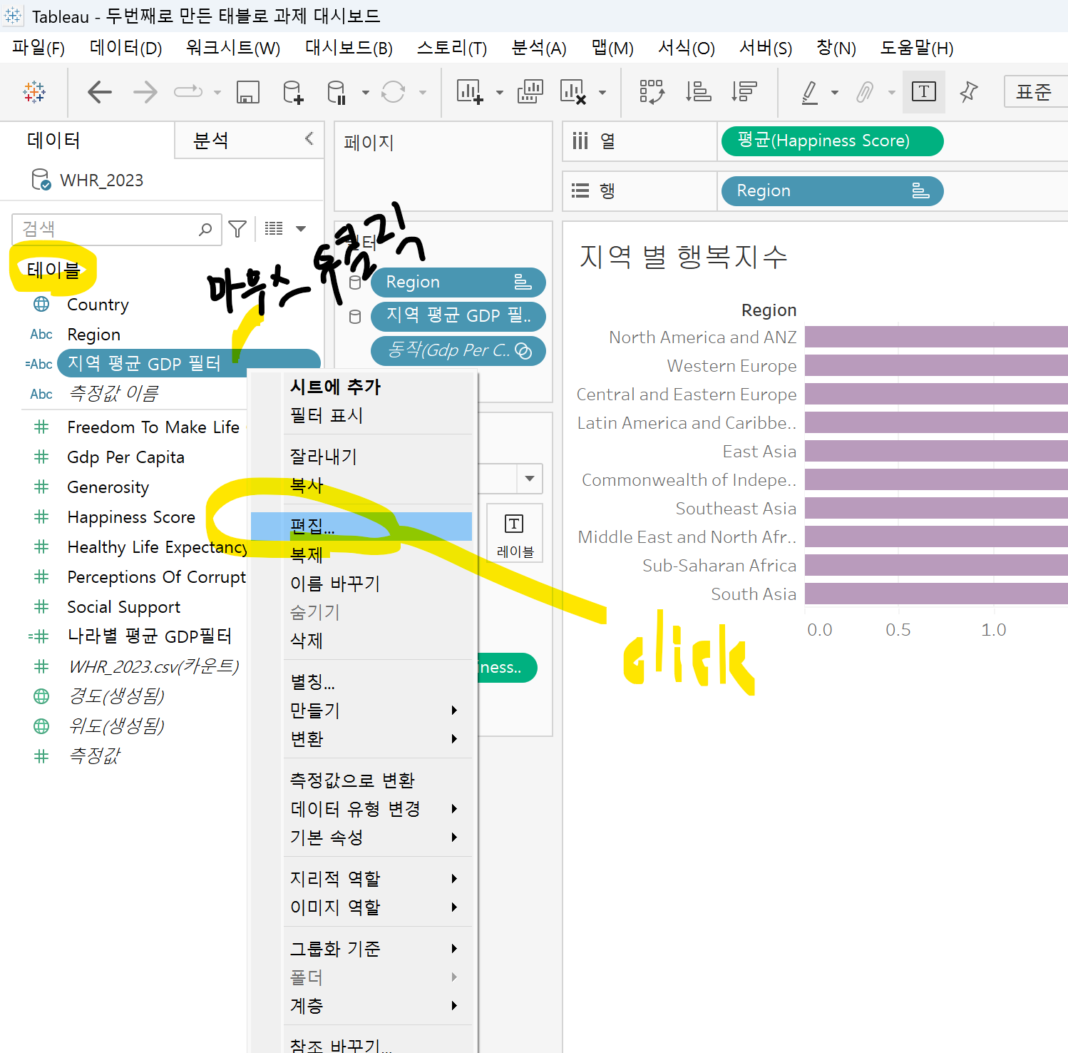 태블로 과제를 복습해보았다. 혼자 다시 풀어봤다. 누군가의 설명을 듣고 그대로 해서 해보는게 사실 내 머릿속에 들어오지 않아서 다시 풀어봄.