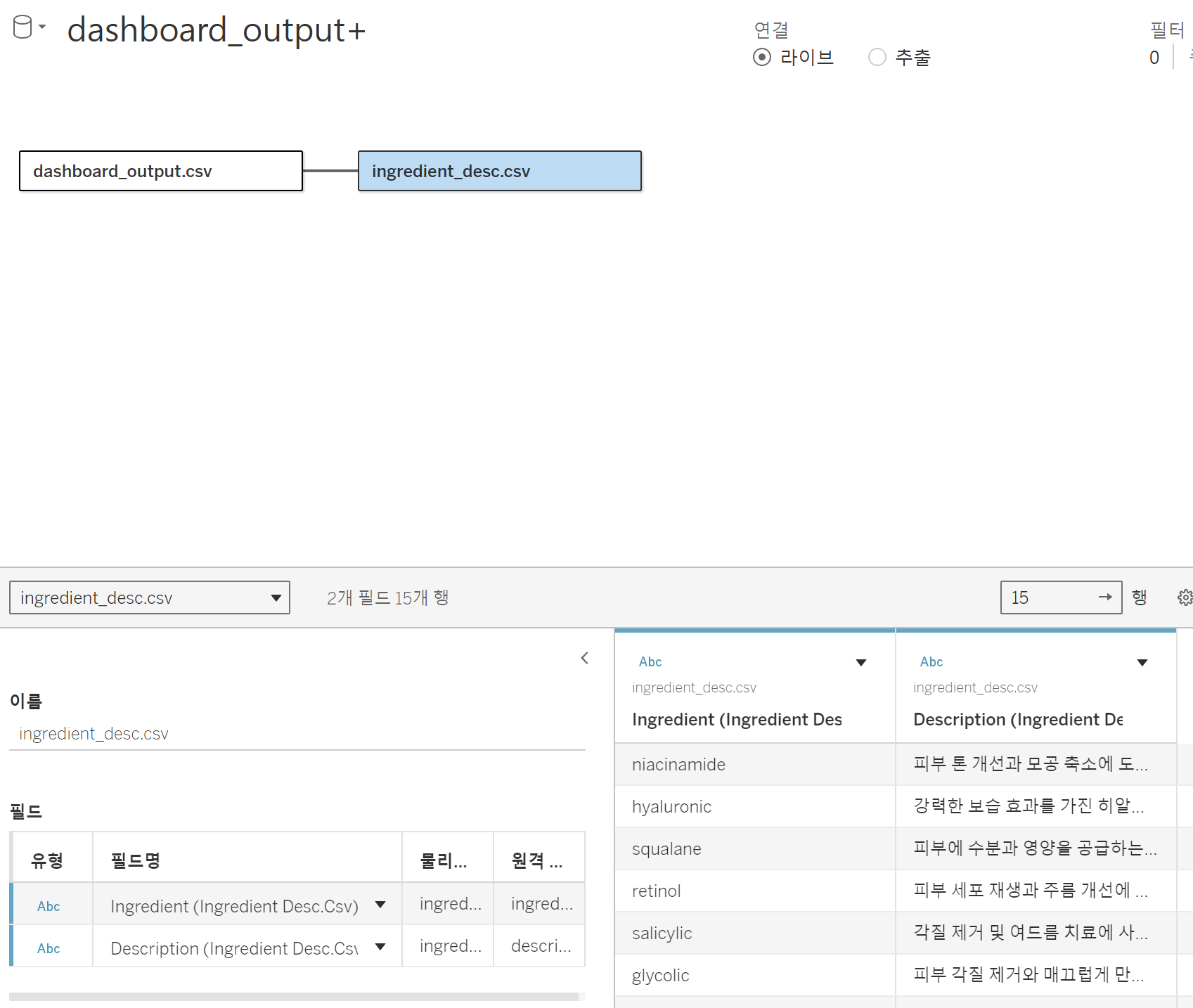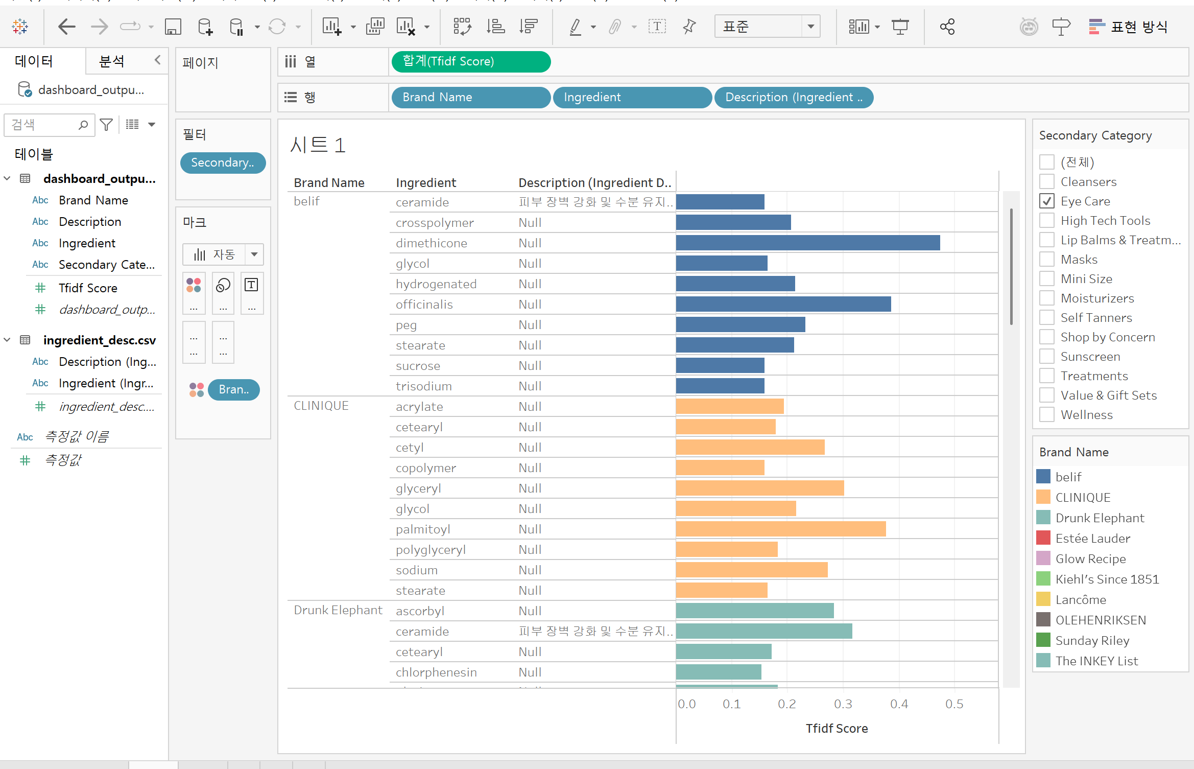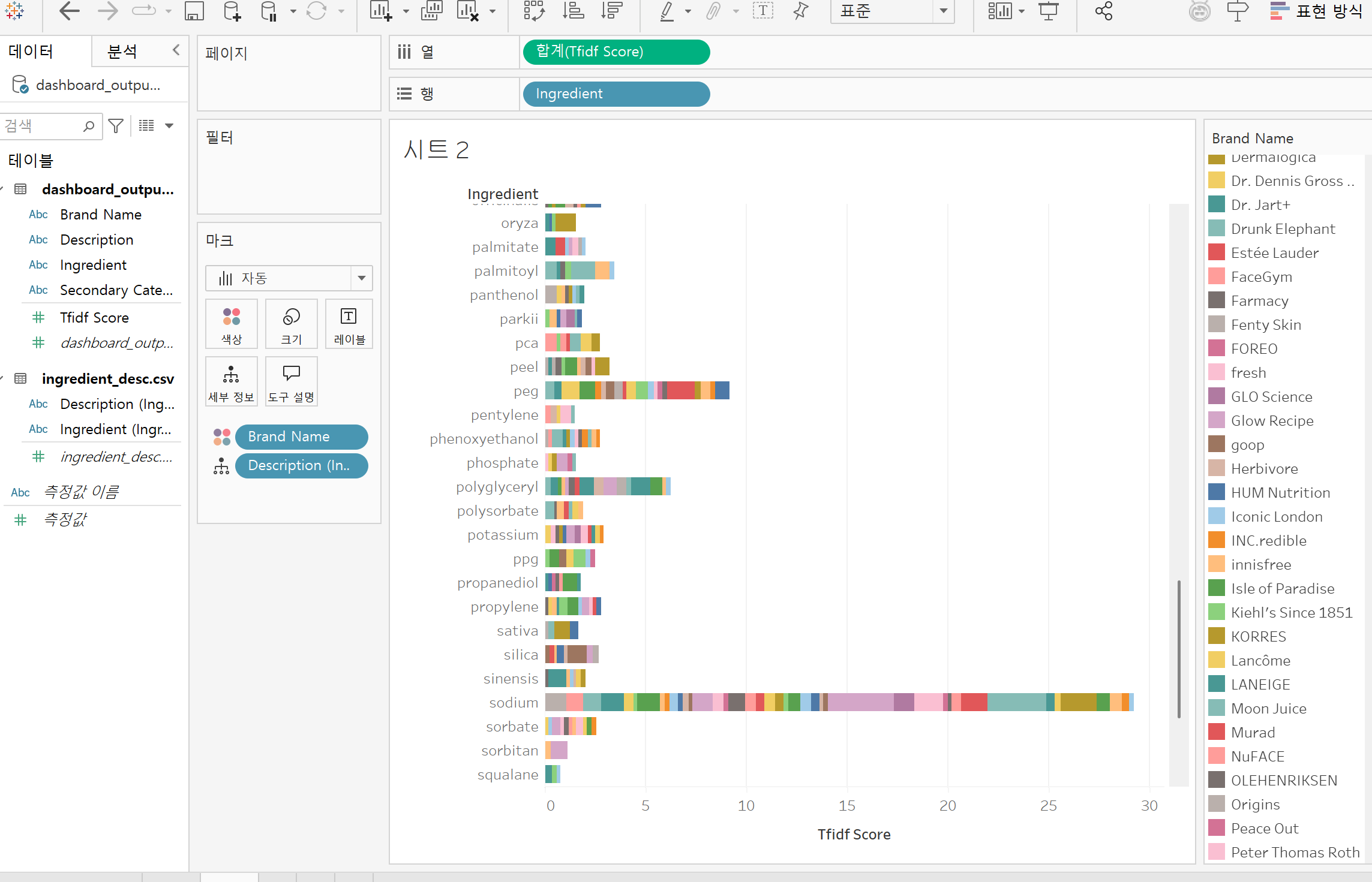 브랜드별 tf-idf분석해봐서 타 브랜드에 비해 많이 들어있는 성분들을 뽑아보았다. 디스크립션은 따로 테이블을 만들어놓아서 이걸 다 입력을 해야한다.. 수동으로... 뭐 자동방법이... 있던 것 같긴한데..