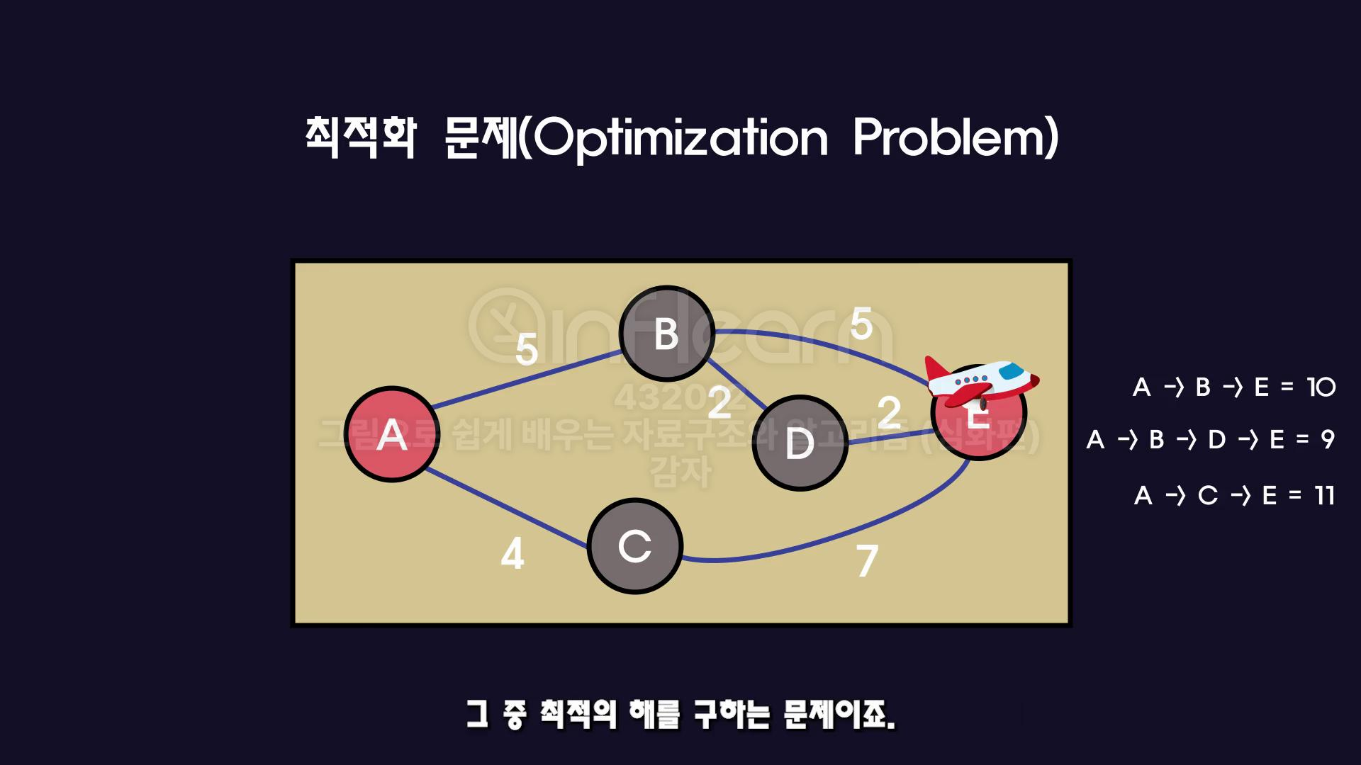 - YES/NO 대답 못하고, 여러 경우의수를 계산하여 최적의 해를 구하는 문제를 "최적화문제"라고 함.