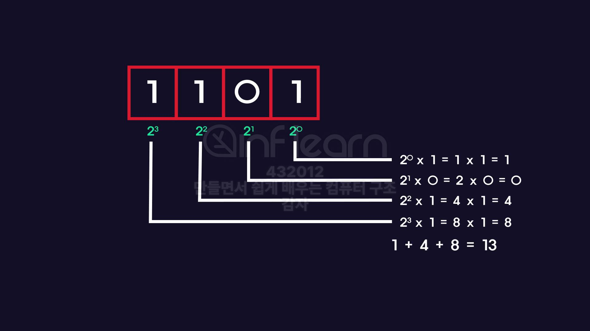 - 자릿수를 2의n승으로 표현하고 , 그 자리에 들어있는 값을 곱하여 , 모든 자릿수의 합계를 구하면 10진수로 변환이 가능하다.
