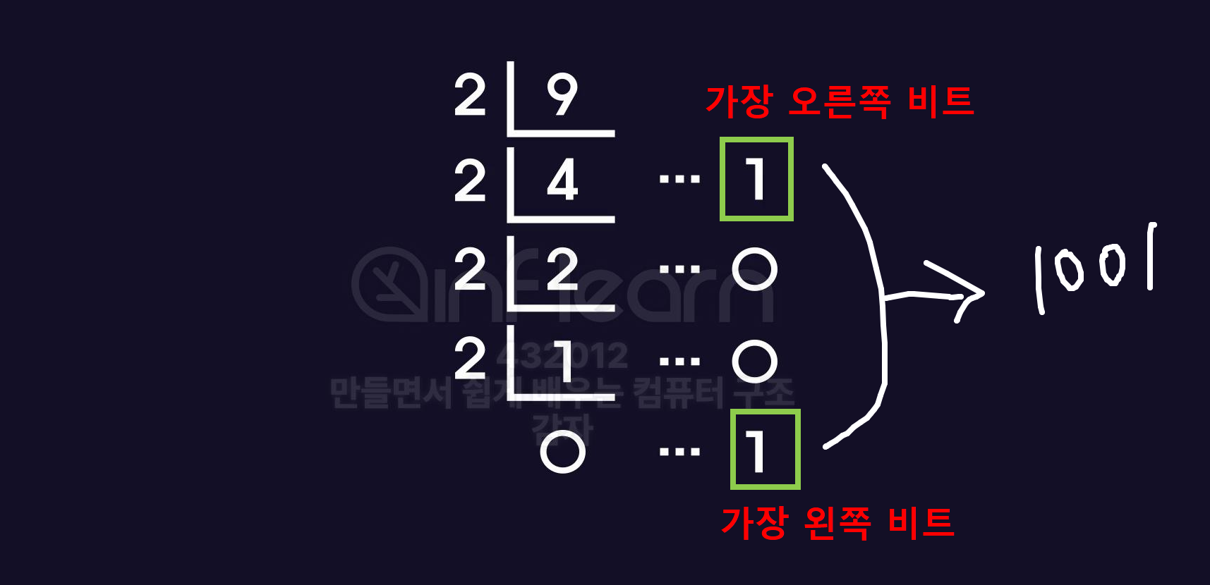 10진수 "9" 를 2진수로 변환 시켜보자.