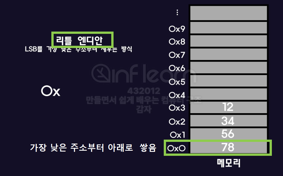 - 낮은 주소를 아래부터 채우는 방식이 : 리틀 엔디안