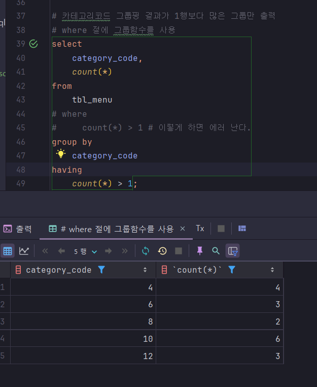 ❓왜 에러가 날까? 그룹핑이 where보다 처리 순서가 앞이기 때문이다.