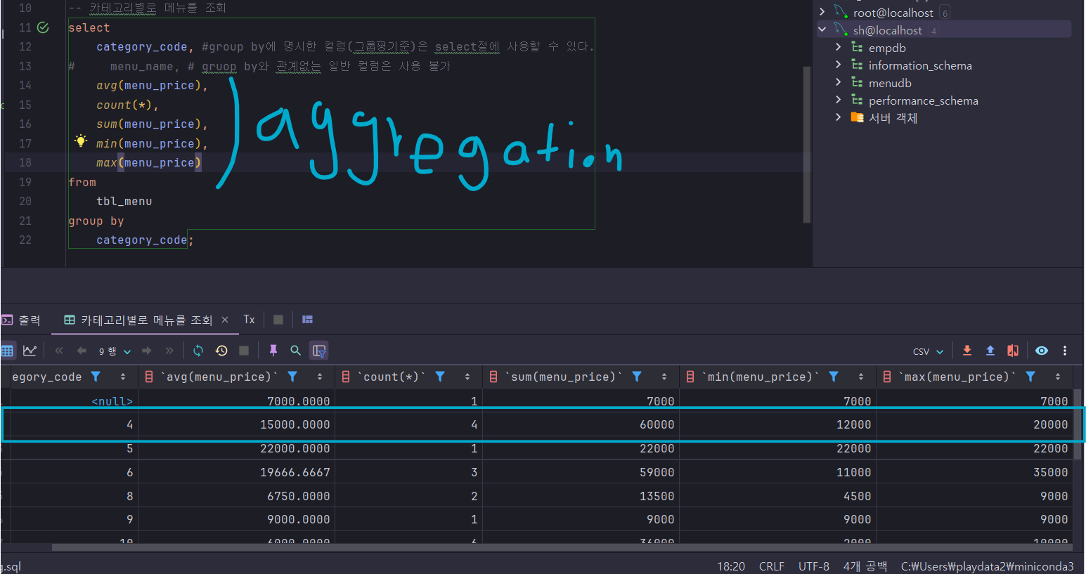 - group by에 명시한 컬럼(그룹핑기준)은 select절에 사용할 수 있다.