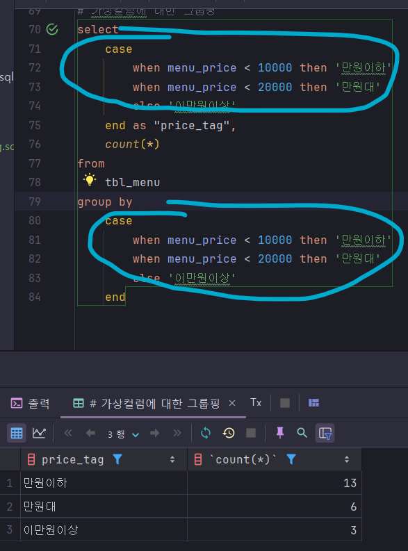 -- 그룹핑 기준은 실제컬럼/표현식(가상 컬럼) 등이 될 수 있다.