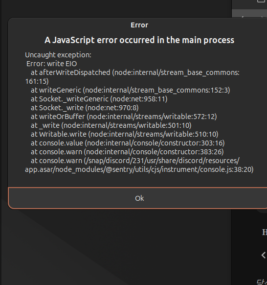 리눅스 우분투 환경에서 디스코드를 snap으로 설치하고 실행한 다음에 끄려고 했더니 저런 에러가 발생했다. 설치한 걸 없애고 다시 깔아서 실행해도 같은 에러가 발생한다. 구글에 찾아봐도 다들 고통만 받고 있고 해결한 사람이 안 보인다.