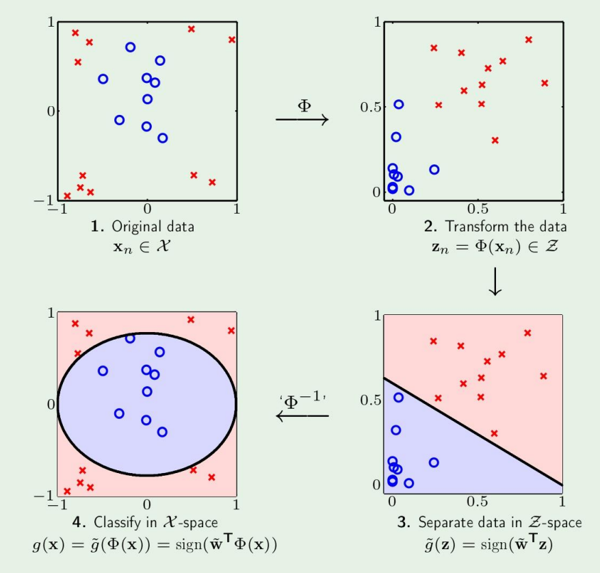 여기서 결국 data에 대해 mapping을 하는것이고, w에 대해 하는것이 아니기 때문에 원래 공간으로 hypothesis를 옮겨오면 원래 공간에서 boundary를 나타내게 된다.