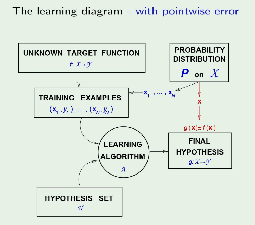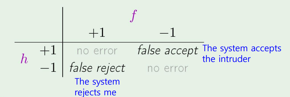 로 표기하였다. 이는 당연하게도, 정확한 target을 찾을수없고, 따라서 자연스럽게 error가 생긴다. ML의 목적이 hypothesis를 찾는것도 있지만, 이 error을 줄이는 목표를 잊으면 안된다!