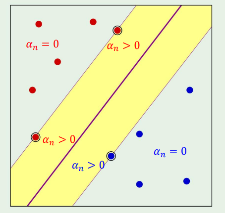 이게 무슨 뜻이냐면, αn(yn(wTxn+b)−1)=0 이라는 뜻은 α=0 이거나, 아니면 wTxn+b 가 1이라는 뜻이다.