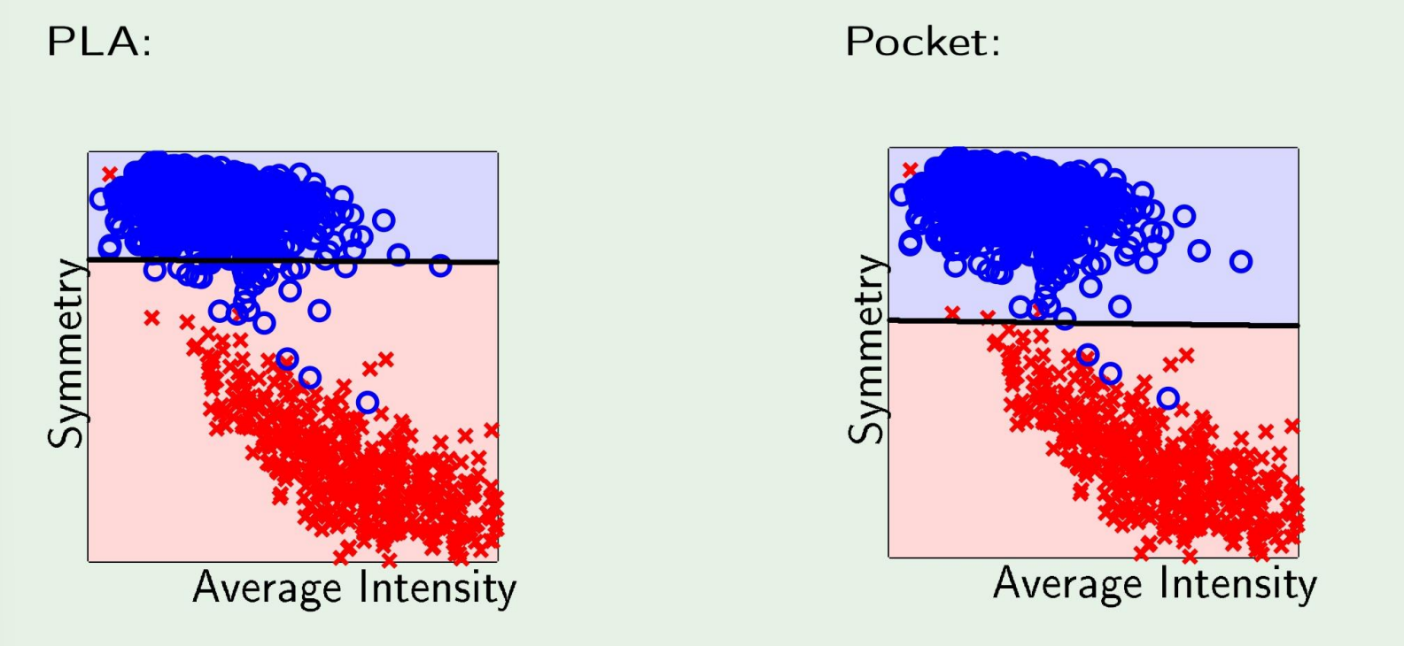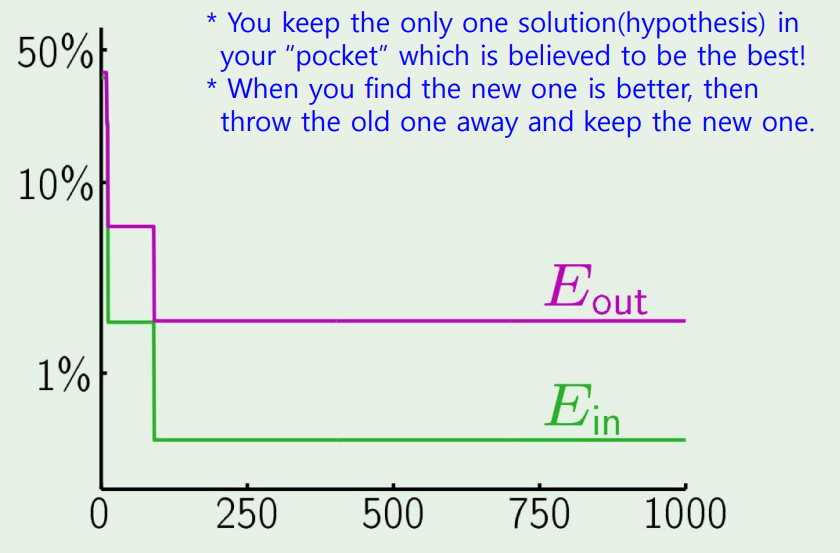 매번 새로운 weight마다 업데이트하는 PLA보다 pocket이 좀더 잘 분류하는것을 확인할 수 있다