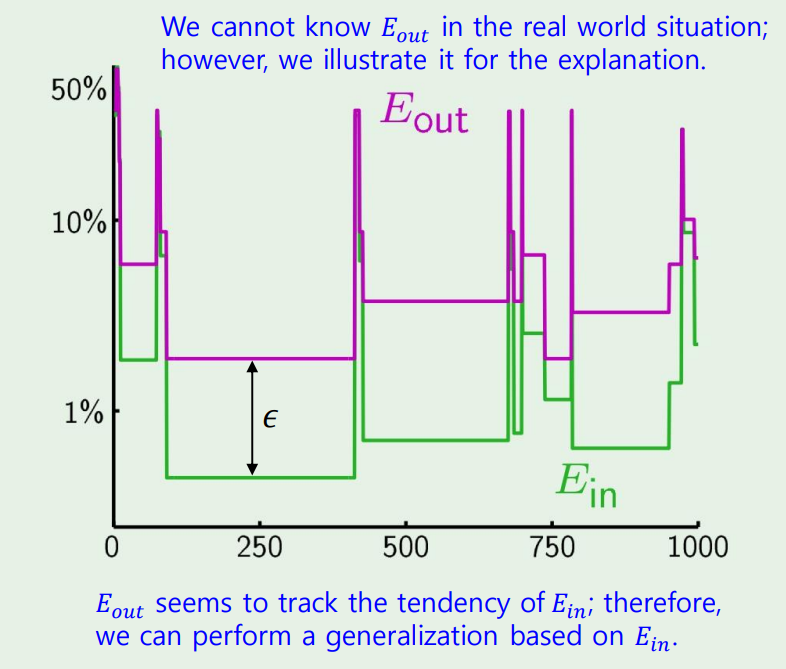 사실 우리는 을 알수없지만, hoeffding에 의해 만큼의 차이가 존재한다는것을 알고, 우리의 목표는 그 차이를 줄이는 것이다!