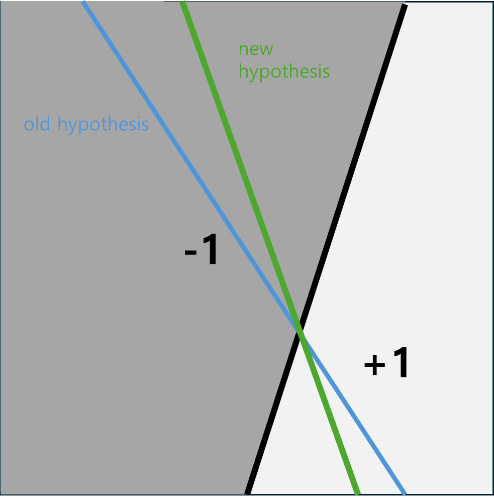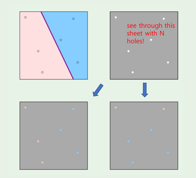 수많은 M개의 hypothesis가 있지만, 들어오는 sample에 대해 구멍이 뚫린 회색종이로 가려놓고, 분홍색과 파란색이 어떻게 되는지를 살펴보는것이다.