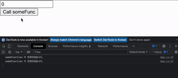state가 변경되면 컴포넌트가 재랜더링되는데, App 컴포넌트가 재랜더링되면 App 컴포넌트 안에 있는 함수 객체의 주소가 바뀌기 때문에 다르다고 인식되기 때문에 useEffect가 실행되게 된다. 그래서 위의 코드에서 Call someFunc 버튼을 클릭하지도 않고 그냥 숫자만 바꿔줬음에도 someFunction을 의존성배열로 가지는 useEffect 가 실행되는 것이다.