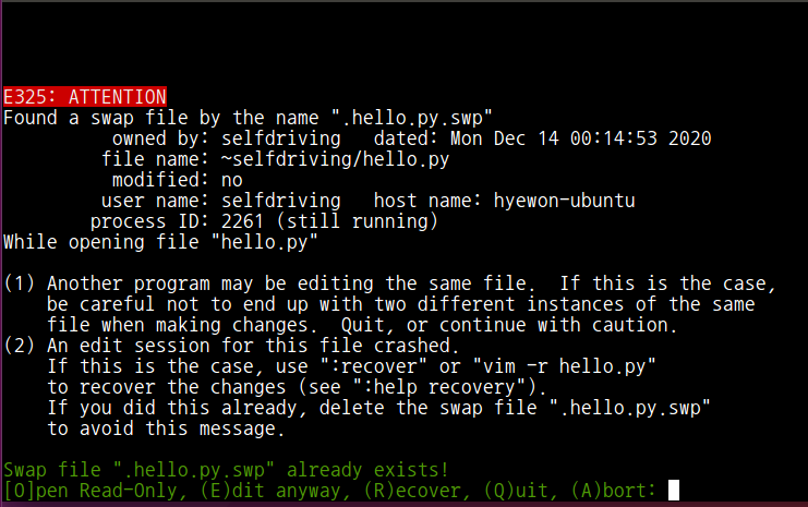파일을 다른 터미널에서 동시에 열었다면 '스왑 파일이 이미 존재합니다'라는 에러 메세지를 볼 수 있다. vim이 swap 파일을 이용해서 작업을 하기 때문이다. 예를 들어, CTRL + Z 명령어로 프로세스를 stop 시키고 다른 작업을 하다가 이런 에러가 생길수도 있다. 그래서 어떻게 해결해야하는지 알아야 한다.
