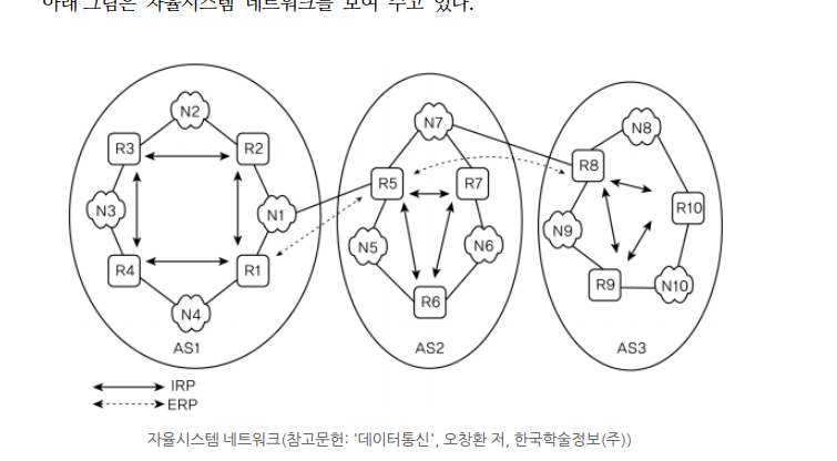 인터넷은 각 as들이 복잡하게 연결 구성된다. 인터넷의 라우팅 프로토콜은 크게 AS내에서 이뤄지냐 아니냐로 나뉨.