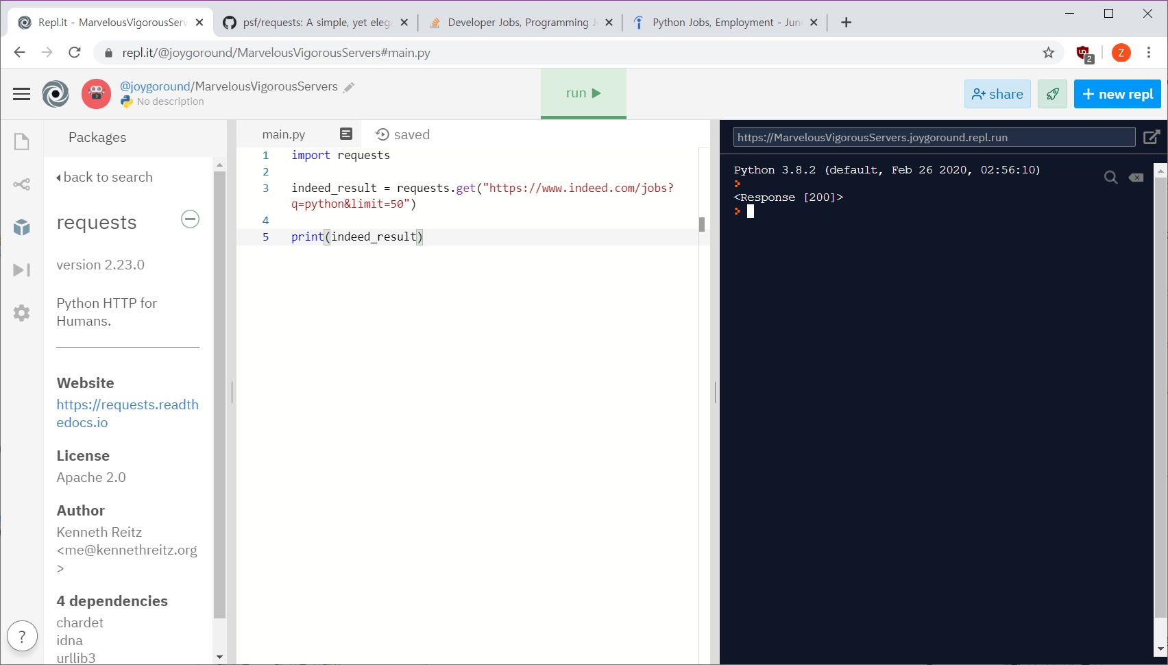 ! 리플잇에서는 다른방법 필요함. -> 패키지 검색해서 add 해주고 파일에 import request 써주기.