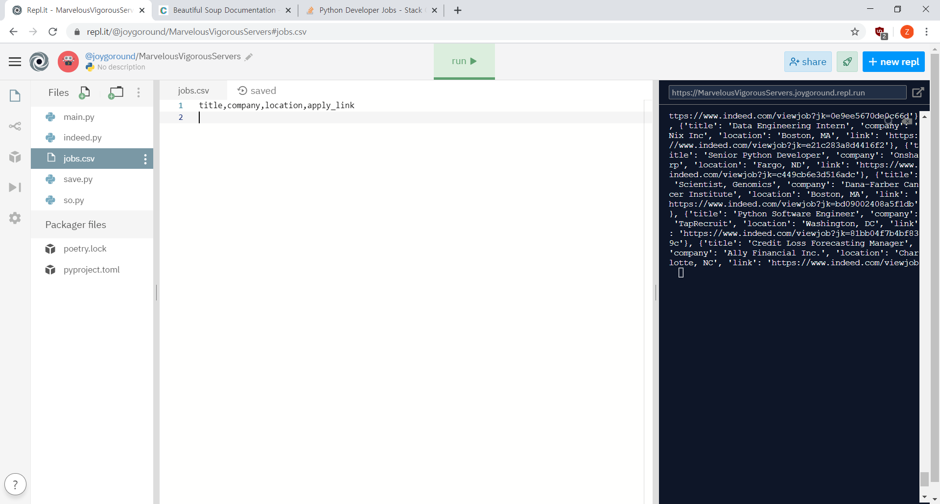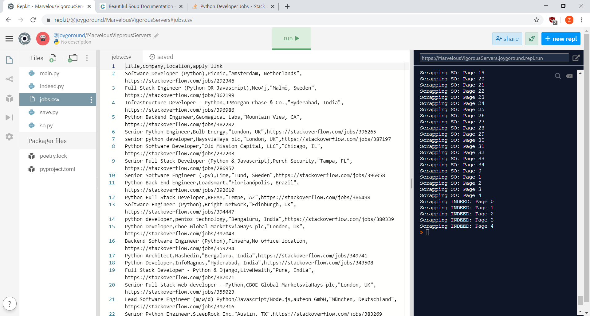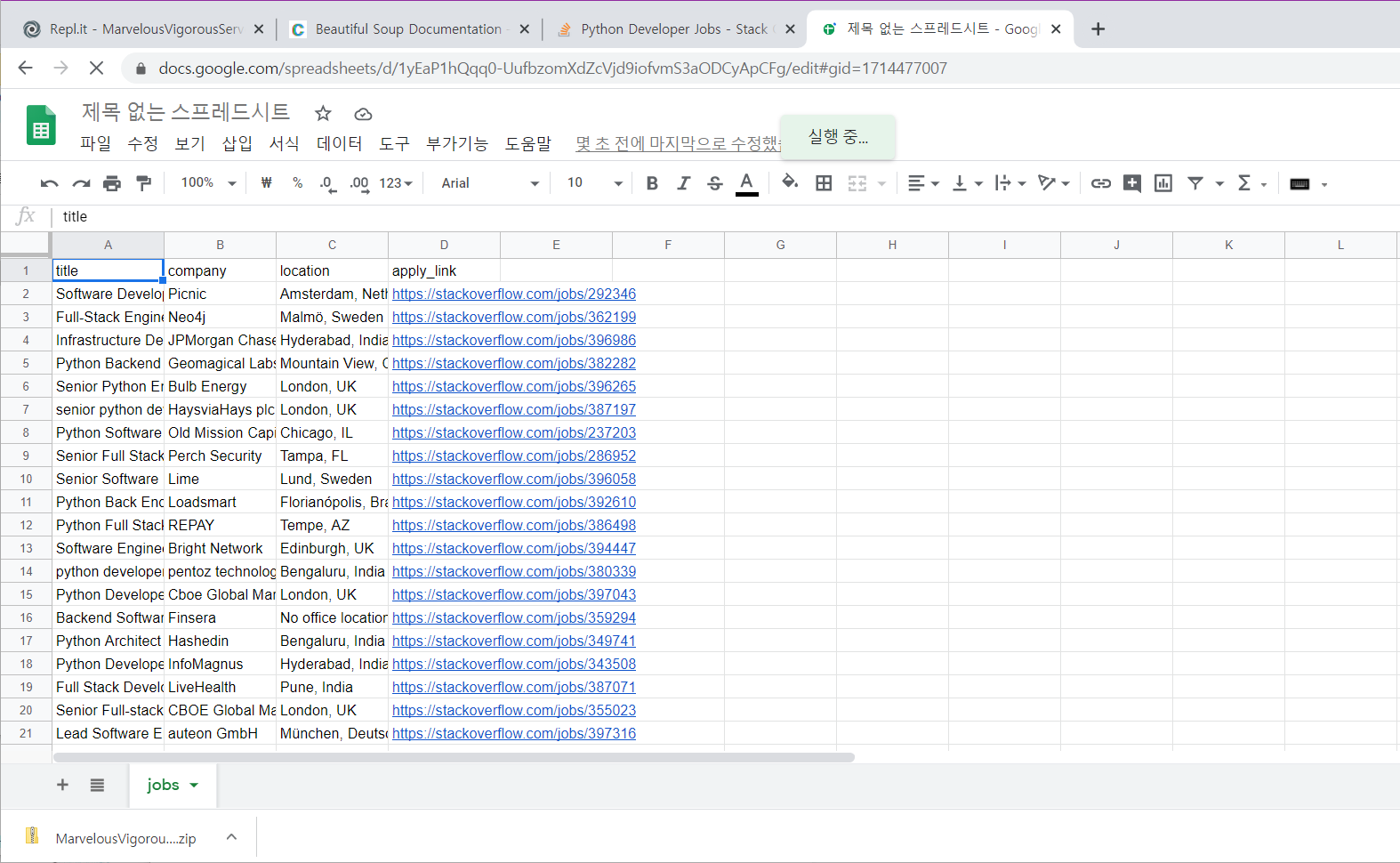 특정 사이트(stackoverflow, indeed)에 있는 특정 검색어 관련(python) 잡 공고를 긁어와서 엑셀 시트에 저장하기