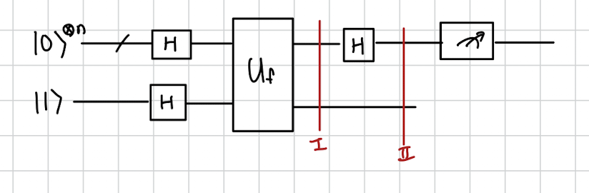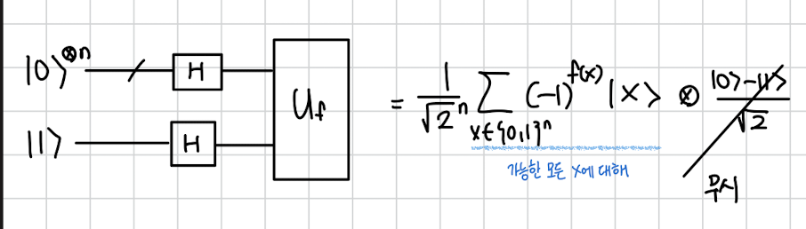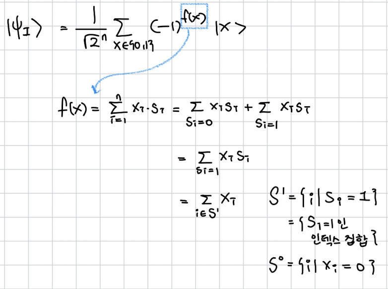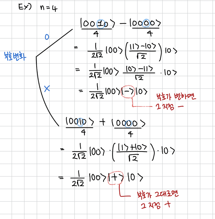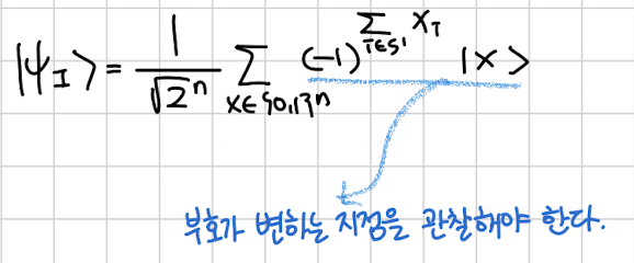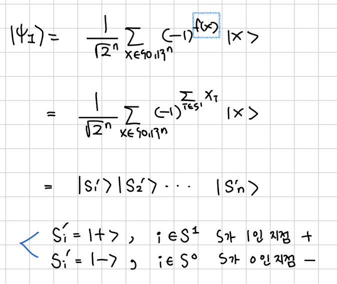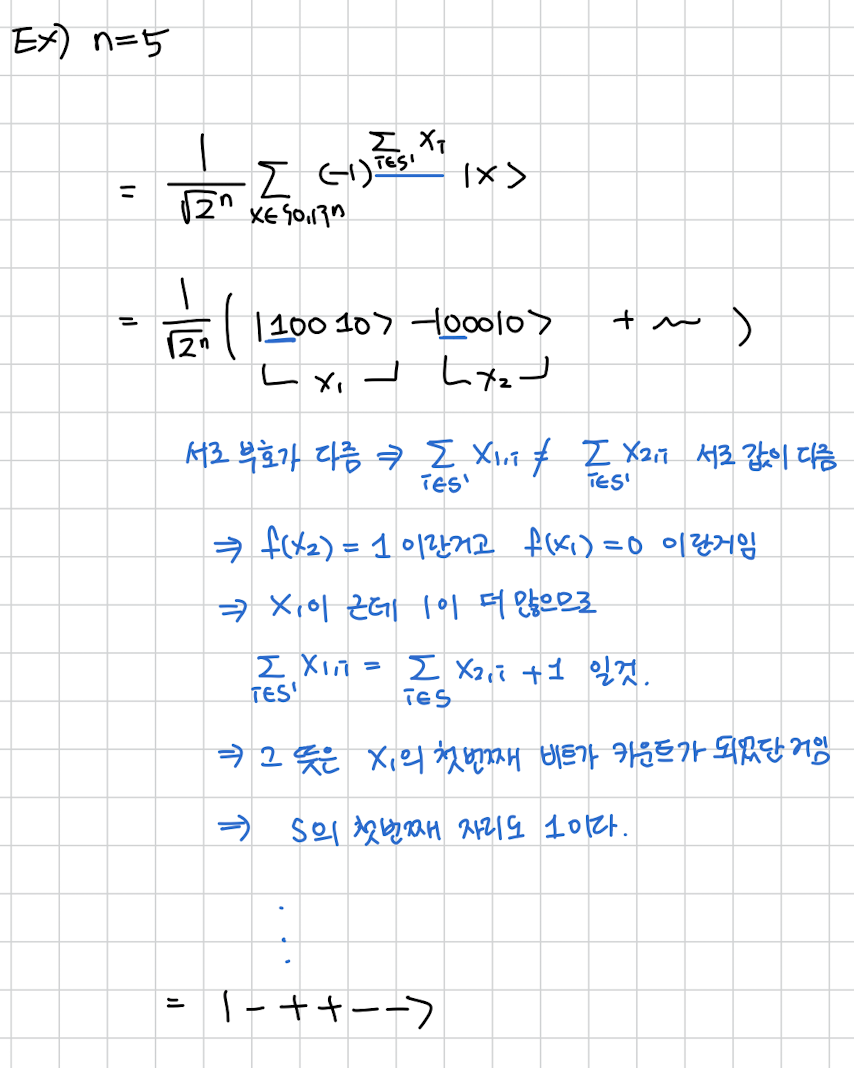 여기까지 가능한 모든 n 비트 x에 대해 각 f(x)값이 x의 부호를 결정하는 superposition상태가 완성되었다.