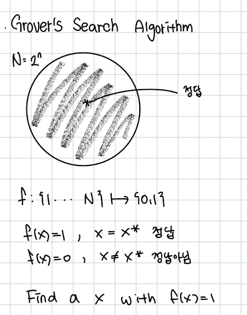Grover Search 알고리즘은 정답을 확인하는 것은 쉬운데 가능한 경우의 수가 너무 많은 경우를 위한 알고리즘입니다. f(x)는 가능한 x를 넣으면 답이면 1을 답이 아니면 0 을 주는 함수입니다. 이 함수를 가지고 답을 찾고 싶습니다.