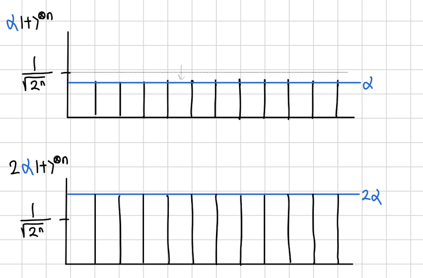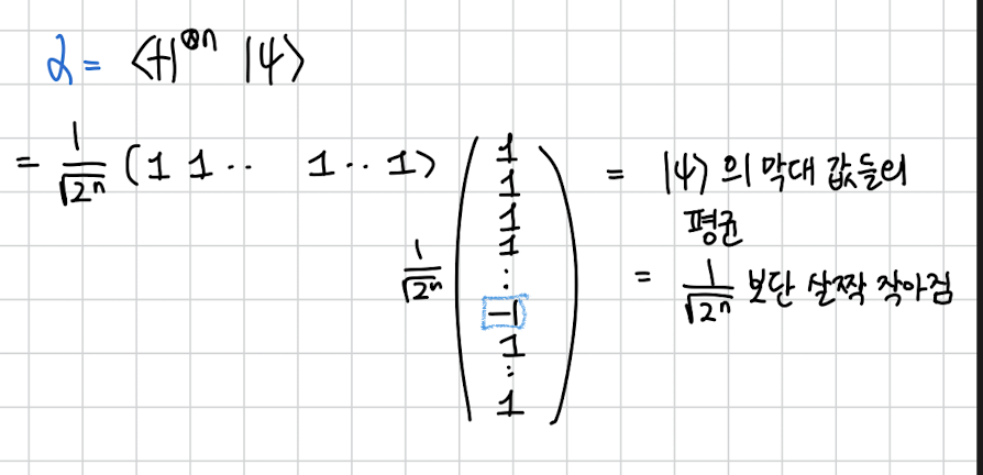 여기서 중요한건 이 벡터에서 어떻게 생겼는가 입니다. 정의에 대해 생각해보면 저 애는 모든 가능한 n bit 상태를 다 균일하게 포함하고 있는 상태이기 때문에 생각보다 간단히 저렇게 모두가 인 벡터가 됩니다 .