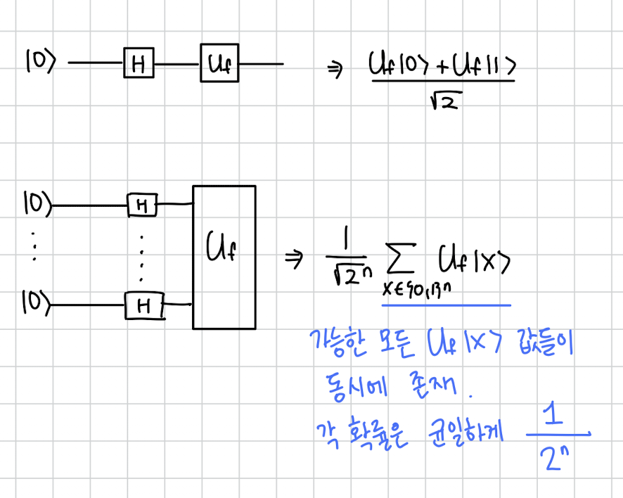 저런식으로 n비트의 모든 가능한 Uf 적용값을 한번에 동시에 계산할 수 있습니다.