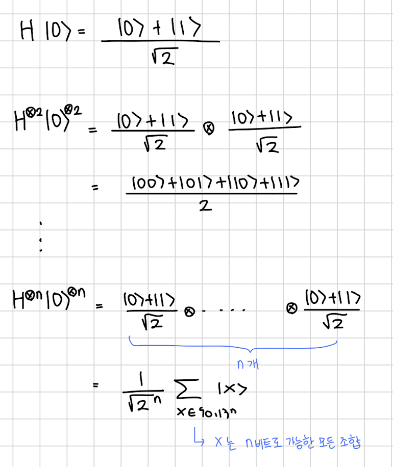 n비트에 H를 각각 적용한 결과는 그럼 n비트로 만들 수 있는 모든 가능한 x가 superposition상태로 더해져서 나오게 됩니다.