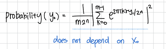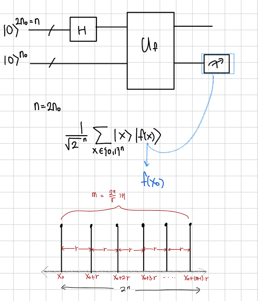 저번에 Simons 알고리즘이 한 를 관측했을 때 가능성이 있는 가 두가지가 있어서 그 두 상태가 superposition 상태로 존재하게 된다는 걸 이용했는데 그 개념을 여기서도 이용합니다.