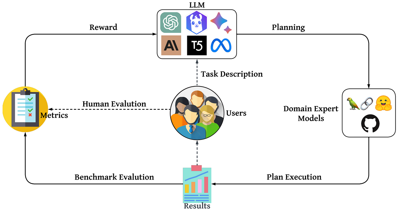 Users โ Task Description โ LLM โ Planning โ Domain Expert Models โ Plan Execution โ Results โ Evaluation (Benchmark & Human) โ Metrics โ Reward โ LLM