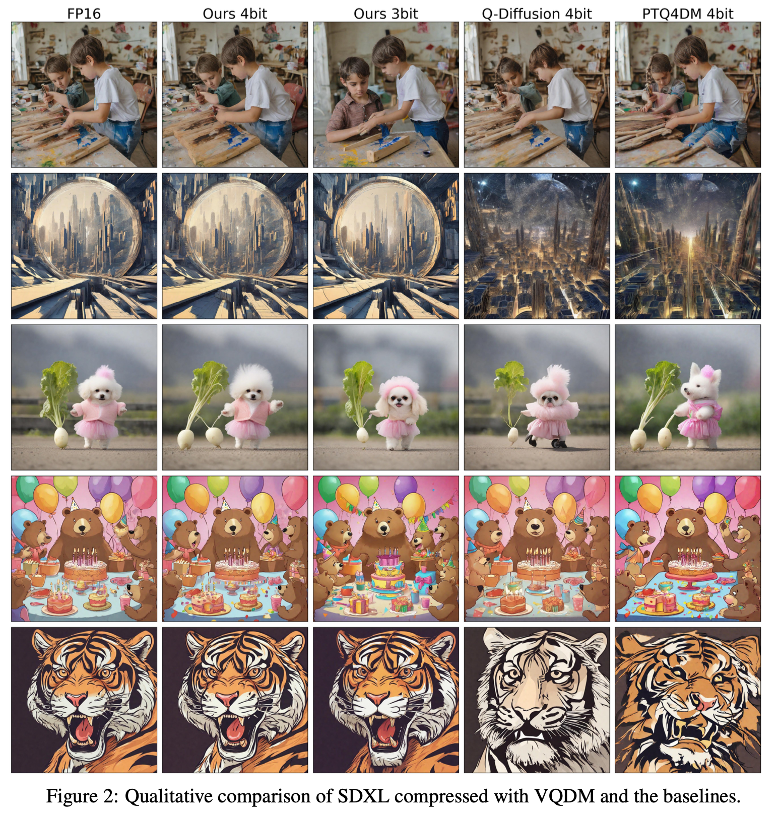 VQDM은 대규모 텍스트-이미지 diffusion 모델의 3비트 압축을 실현하며, 기존 4비트 PTQ 방식 대비 더 나은 품질-압축률 균형을 보여줬습니다.