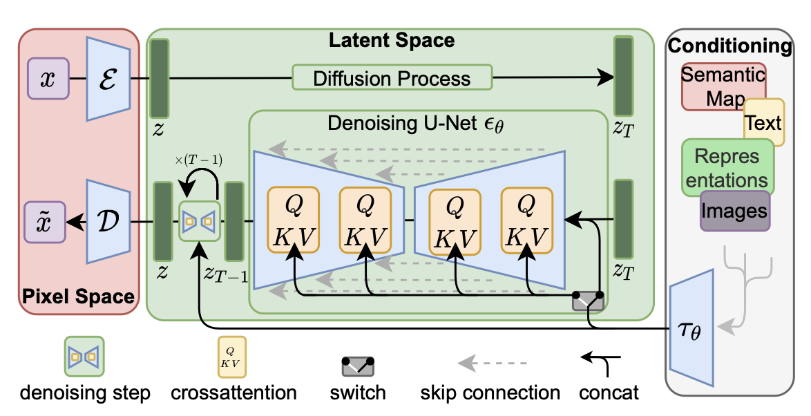 UNet에 cross-attention 모듈을 삽입해 텍스트, semantic layout 등 다양한 modality에 대응 가능.