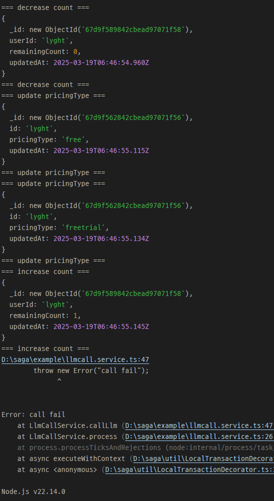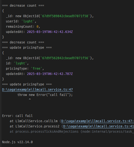 이런 경우 mongodb에서 제공하는 transaction 기능을 사용하거나 보상트랜잭션 SAGA 패턴 을 사용해 볼 수 있다.